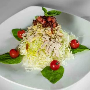 A Myanmar speciality- basil and cabbage topped with shredded chicken and a tangy fish sauce