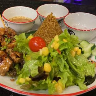 Stir-fried jasmine rice topped with a fried egg and served with chicken satay, tempe and scrambled eggs