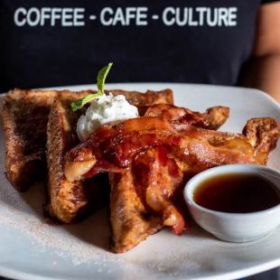 Japanese thick bread coated in spices served with crispy streaky beef and maple syrup