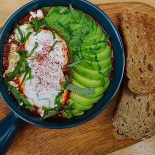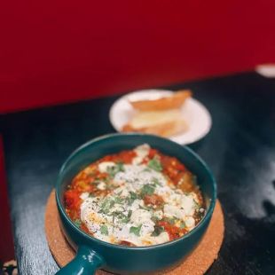Ottoman tomato stew with poached eggs and feta cheese