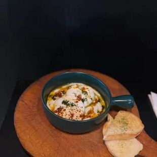 Poached eggs on garlic and dill yoghurt with Aleppo chilli butter
