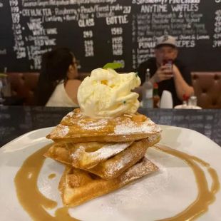 Sweet orange zest waffle with homemade butterscotch and vanilla ice cream