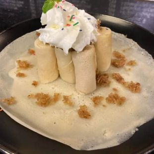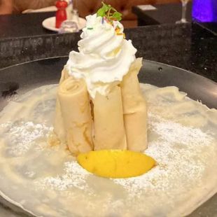 3 folded crepes with caramelised banana and whipped cream
