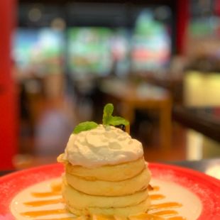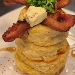 Thick and fluffy pancakes served with homemade butterscotch and banana