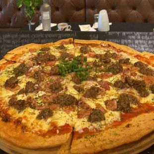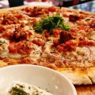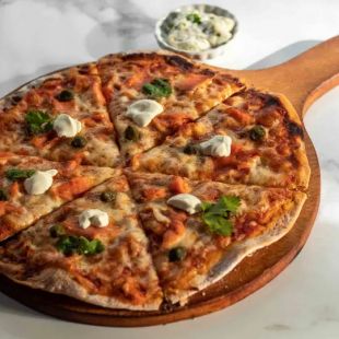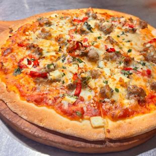 Cheese and smoked chicken chorizo pizza on a rich tomato base